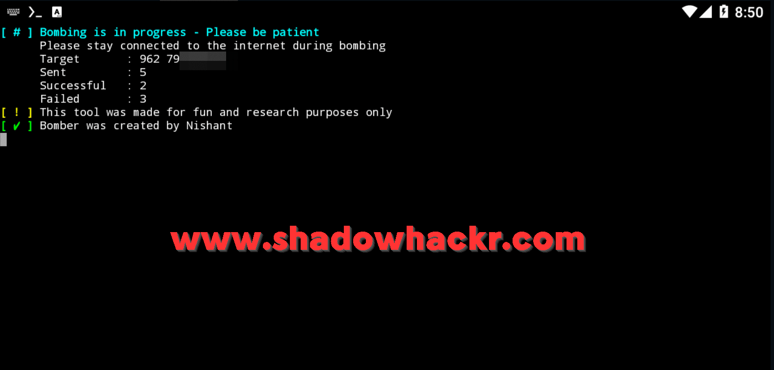 وبذالك تستطيع ارسال رسائل وهميه بعدد لا نهائي من خلال call bomber وايضاً يمكنك عمل اتصال وهمي لأي رقم هاتف تختارة وارجوا ان تستعمل الطريقه بهدف التعلم وليس ازعاج الأخرين .